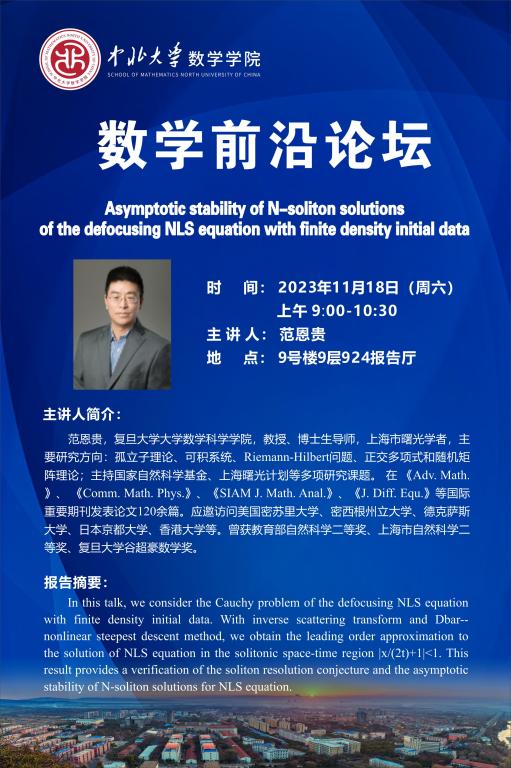 数学前沿论坛第45期 题目:Asymptotic stability of N-soliton solutions of the defocusing NLS equation with finite density initial data